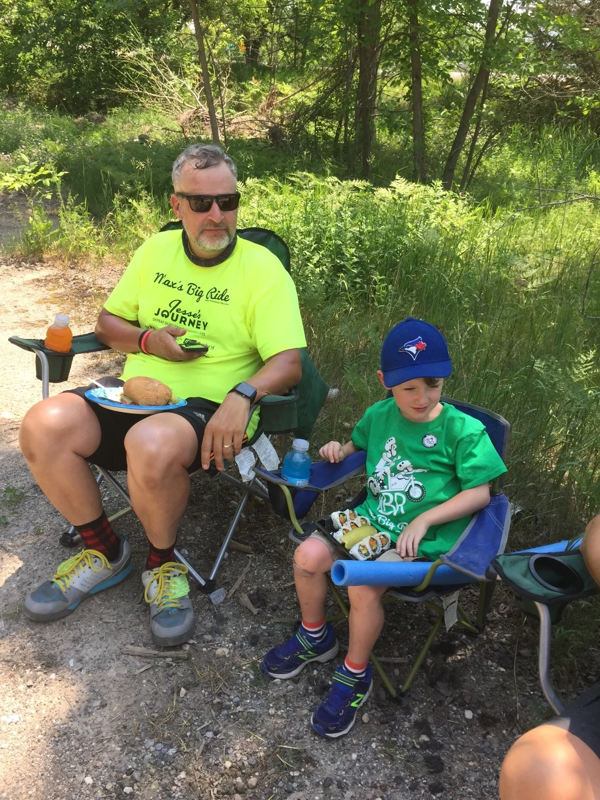 Meanwhile, a crowd was also gathering at the finishing line. There were friends and family, representatives from the Hamilton Fire Department, Jesse's Journey, Max's school, the loyal MBR supporters from Grandma's tai chi class, and lots of people we didn't know who had come especially to see the end of the ride . They were all there, wearing their Max's Big Ride t-shirts just as they had been the year before, and they were all celebrating the completion of the ride. Amazing!