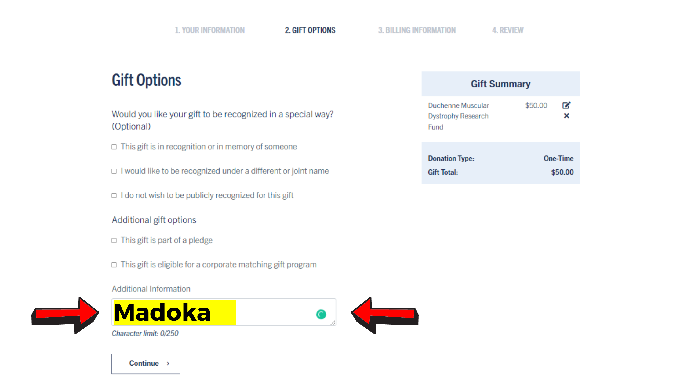 To ensure your donation is added to my fundraising total, please type ‘Madoka’ in the ‘Additional Information’ box in step 2 of the form as shown below and press continue.
