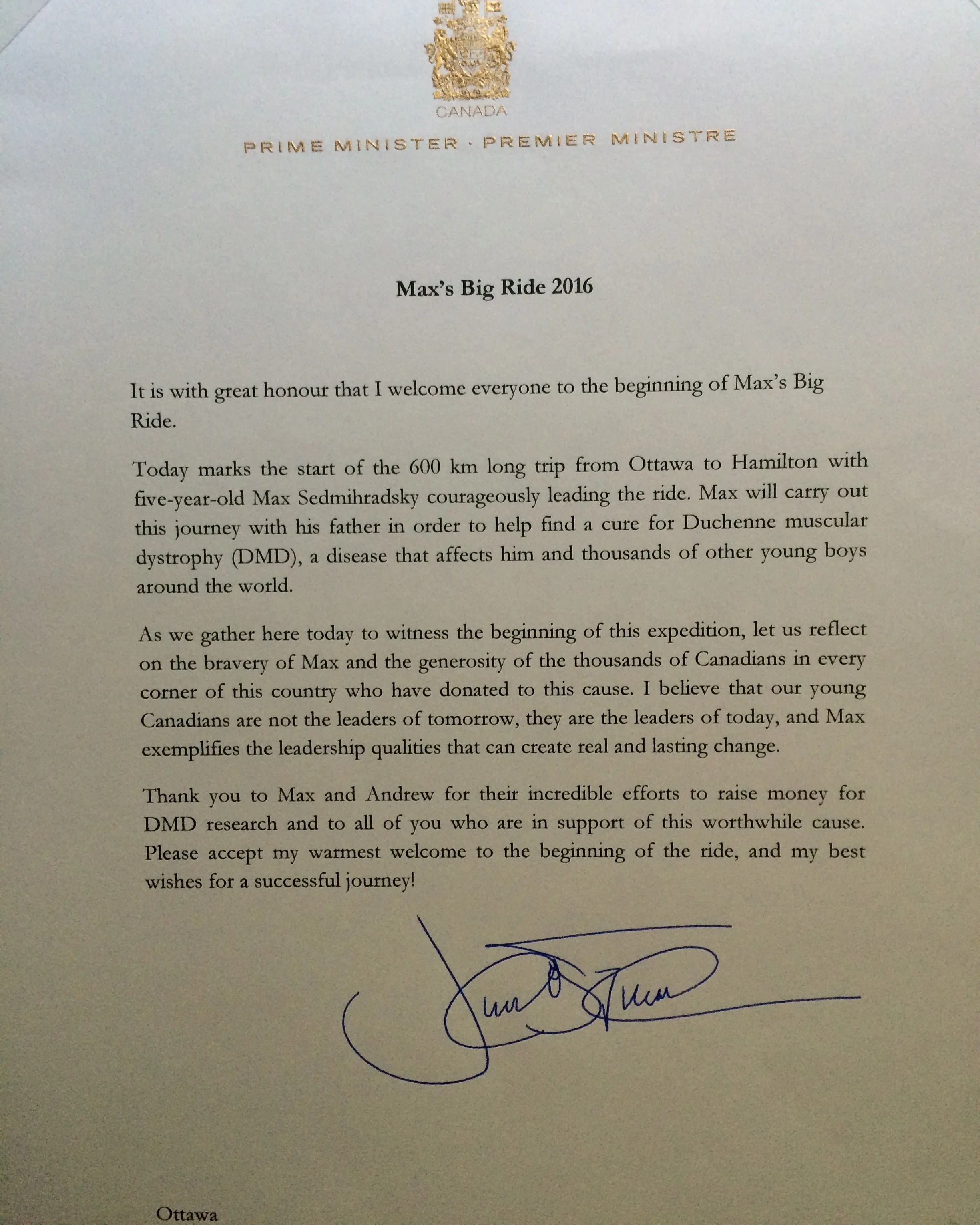 The letter Max received from Canadian Prime Minister Justin Trudeau on June 23rd, 2016.