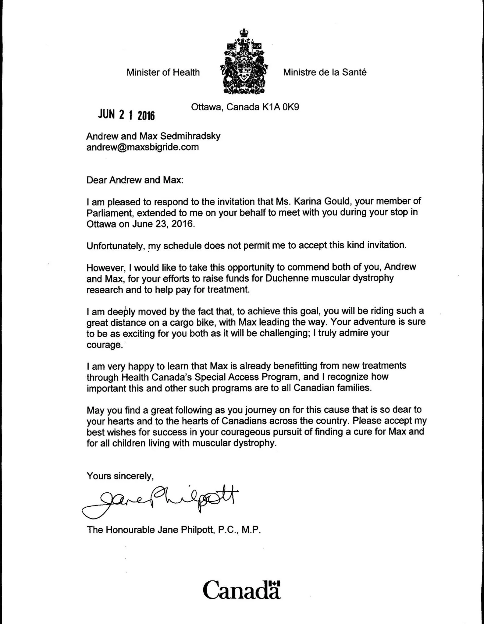 The letter Max and Andrew received from the Minister of Health Jane Philpott on June 21st, 2016.
